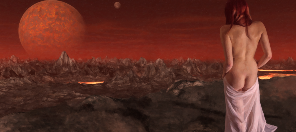 The new series blends studio photography with digital painting, borrowing from Pre-Raphaelite and neoclassical traditions. Figures are shot live, then set into custom digital environments and finished as oils.